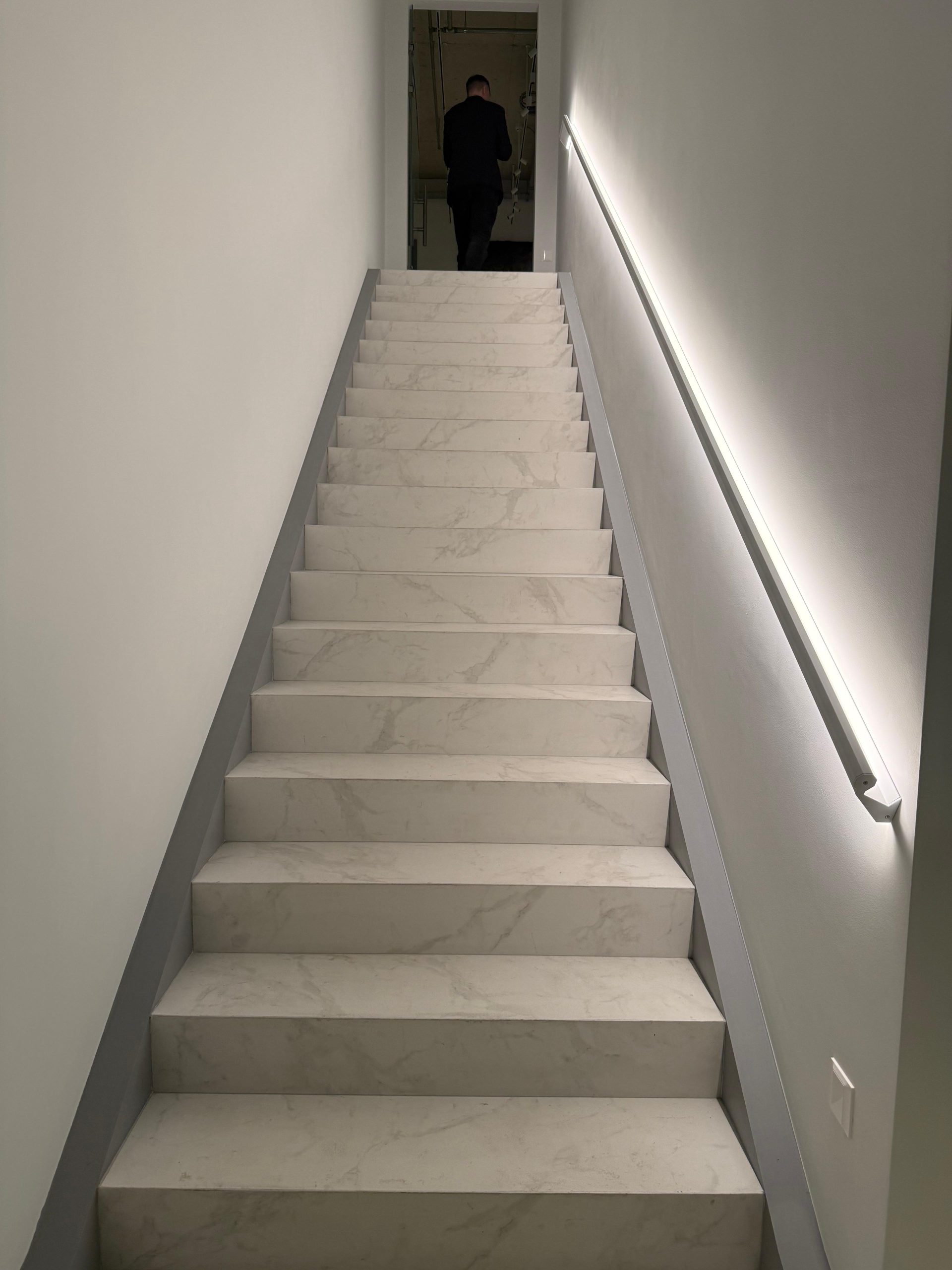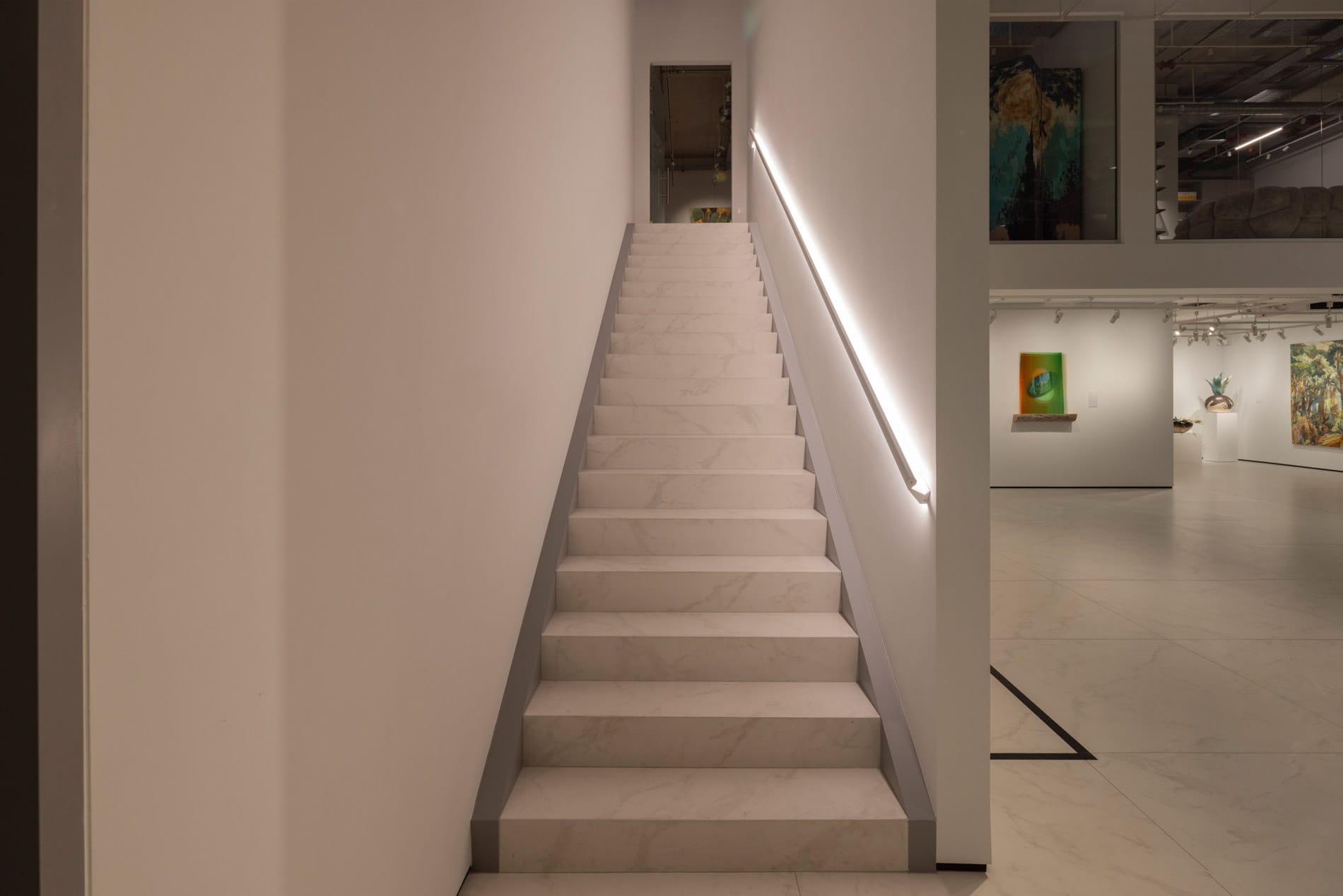 The mezzanine level, accommodating offices and meeting rooms, follows the same adaptable approach, with suspended tracks supporting spotlights, linear luminaires, or pendants for both working and exhibition use. A feature staircase incorporates an illuminated handrail with integrated up- and down-lighting, providing functional illumination and subtle vertical emphasis.